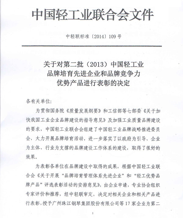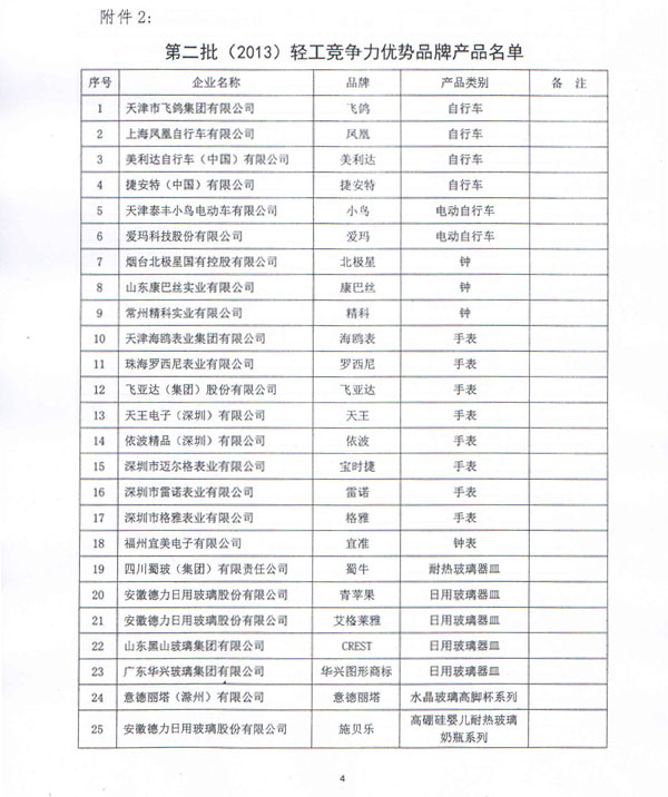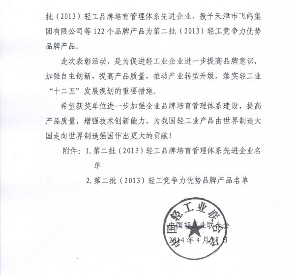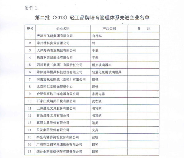 关于对第二批(2013)中国轻工业品牌培育先进企业和