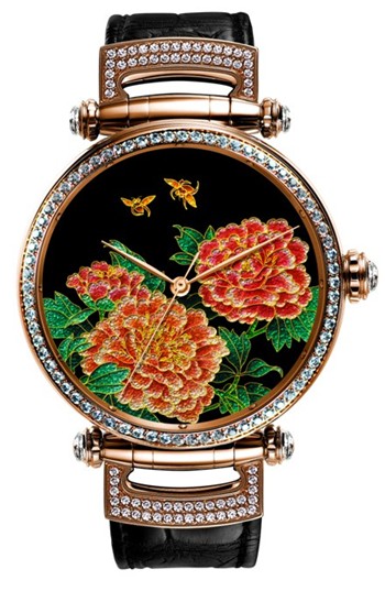 "富贵荣华"珐琅腕表表盘图案取自国画牡丹,牡丹:象征着高贵,典雅气质的人。牡丹做为我国的国花当之无愧。历史上早有国色天香、花开富贵之说,它的雍容华贵在许多文学艺术作品中都有充分的表达。喻意祖国的繁荣昌盛,牡丹乃花中之王,是精神的象征,意味着民族的团结,国家的兴旺的欣欣向荣气氛。