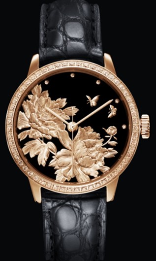 与唐代宫廷御用金雕技艺一脉相承,将卓绝对的黄金錾刻技艺用于表盘,创造出雍容华贵的黄金盘面。"大吉大利"男表中锦鸡与山石形象高贵而高傲,"富贵荣华"女表中牡丹花细腻而妩媚,阳光照来,美不胜收。