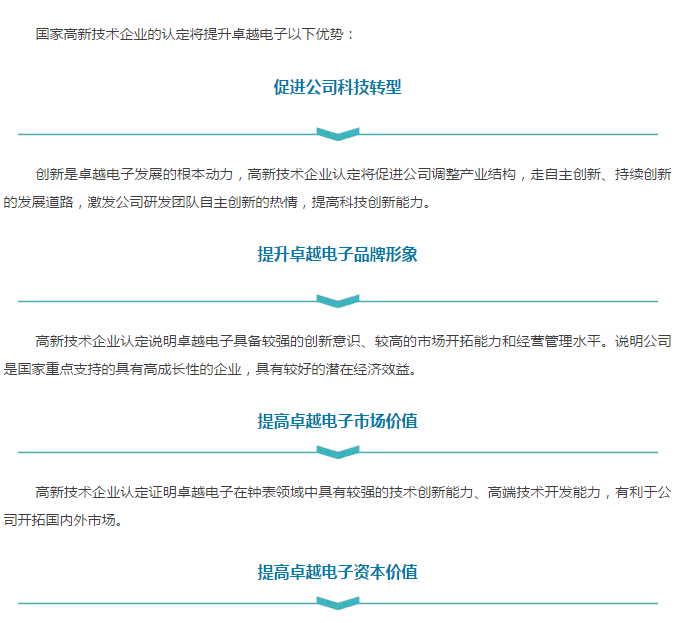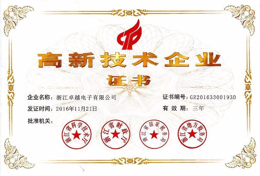 经过国家相关部门的严格审核,浙江卓越电子有限公司被认定为“国家高新技术企业”!这标志着卓越电子在自主知识创新、核心专利产权,科技技术研发及成果转化方面,均达到行业领先水平,且在钟表领域中具有较强的市场价值和资本价值。