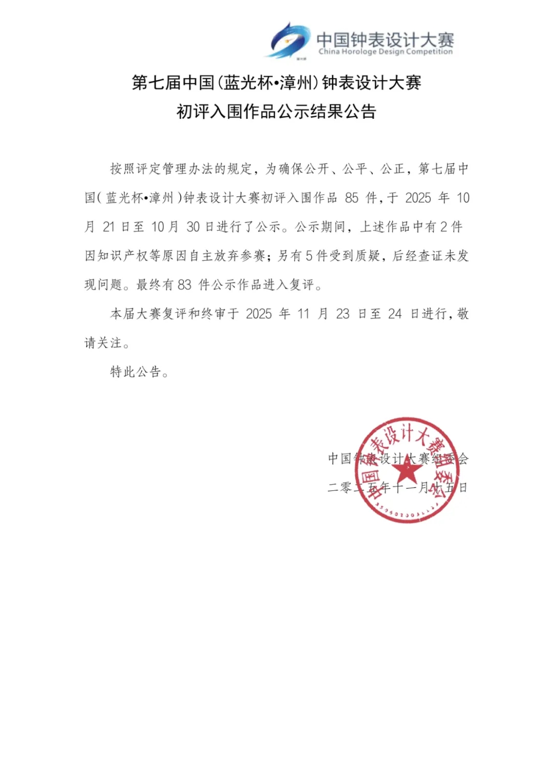 第七届中国(蓝光杯·漳州)钟表设计大赛初评入围作品公示结果公告