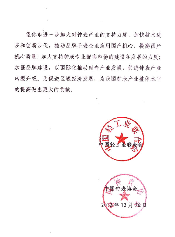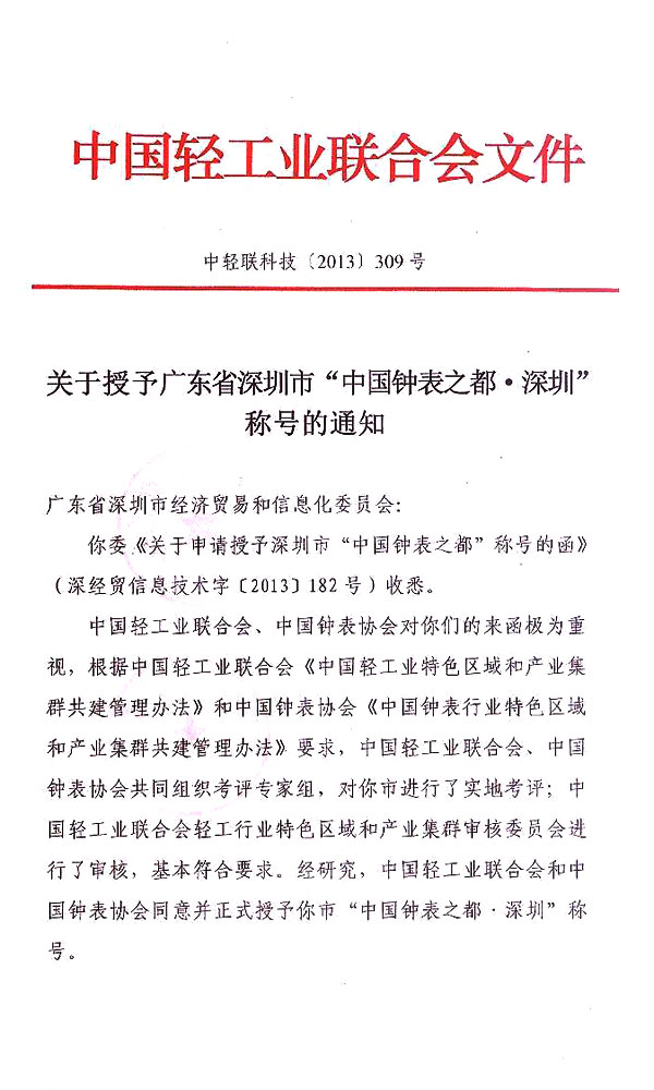 关于授予广东省深圳市“中国钟表之都·深圳”称号的通知