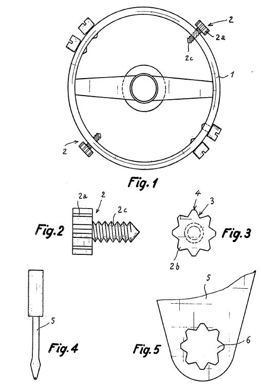 首先,螺钉式无卡度摆轮的代表作应该是来自于1957年劳力士的专利技术,图中Fig1所示的是螺钉式无卡度摆轮,它由摆轮1和一对可调节的螺钉2以及其它不可调节的螺钉组成,Fig2显示可调节螺钉2螺钉帽2a和螺纹2c两部分构成,其中螺钉帽2a的形状为花瓣形2b,此设计意图是花形螺钉帽可以与专用调节工具5的花形孔6相互配合实现调节螺钉2,Fig4和Fig5所示的就是此工具,操作方法比较简单,只要根据前文所说的原理以所需要调整的机械手表的快慢来决定是将螺钉旋出一些距离还是旋入一些距离;