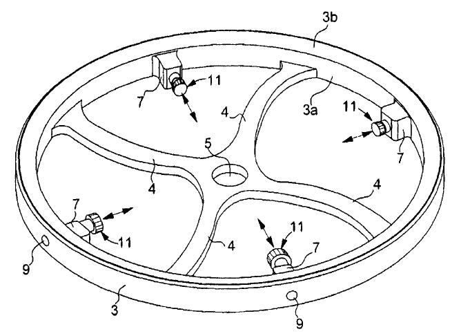 其次,本类型无卡度摆轮的最新代表作来自于欧米茄的专利技术,根据图中所示我们可以了解此无卡度摆轮的主体由摆轮3和四个螺钉11组成,而摆轮3本身又包括了与摆轴配合的中心孔5、四根摆梁4、四个带有内螺纹的凸起7与四个螺钉11配合,欧米茄的此项无卡度摆轮技术最重要的创新点就是将本类型的传统结构方式改变为内旋螺钉,这种设计方式的优势在于可以将摆轮外径最大化,也意味着摆轮可以获得最大的转动惯量需求,而原先的设计方式受到了螺钉位于摆轮外缘的限制,它的操作方式与前文思路是一致的。