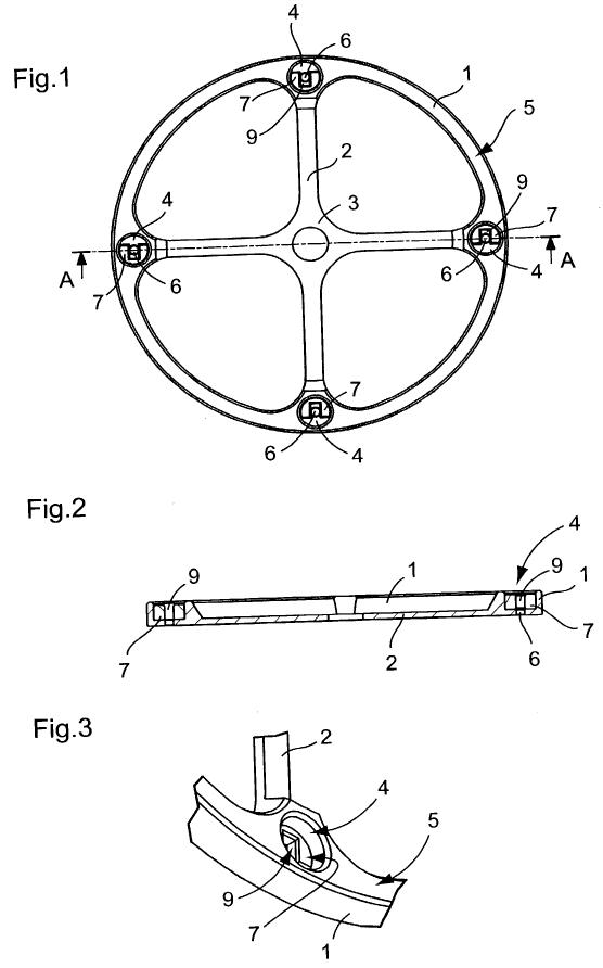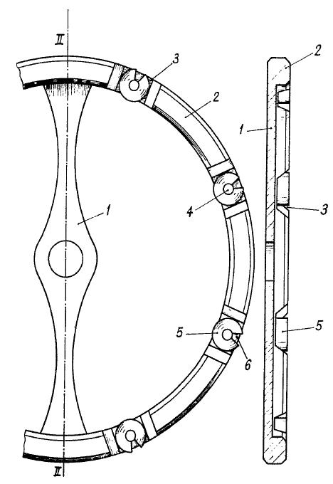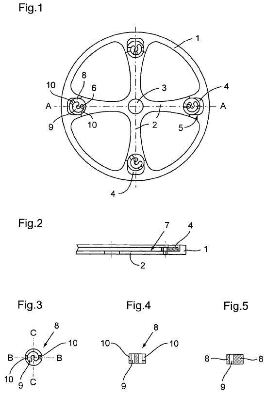 砝码式无卡度摆轮的经典代表作非百达翡丽莫属,此品牌是本类型无卡度摆轮的一贯推崇者,这一点可以从它于1951年获得的专利技术得到证实,此技术以摆轮1与八个可以调整的砝码5为主体,摆轮的外缘2承载了这八个砝码,砝码中心轴4作为砝码转动的支承轴,砝码的形状是字母U形状,包括了外缘3和开口6。