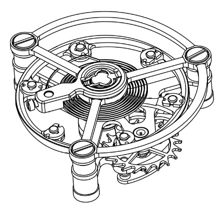 根据此公式,我们可以知道机械手表的振动周期与游丝的工作长度和摆轮转动惯量成正比,即随着游丝的工作长度和摆轮转动惯量的数值变大,振动周期将随之变大,也就是说振动频率将变小,机械手表会走慢,反之则结论相反。为了将走快或者走慢的机械手表调整到标准频率,有两种调整结构可以采用: