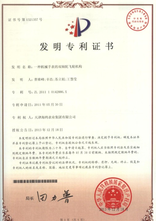奇翼陀飞轮1号发明专利证书