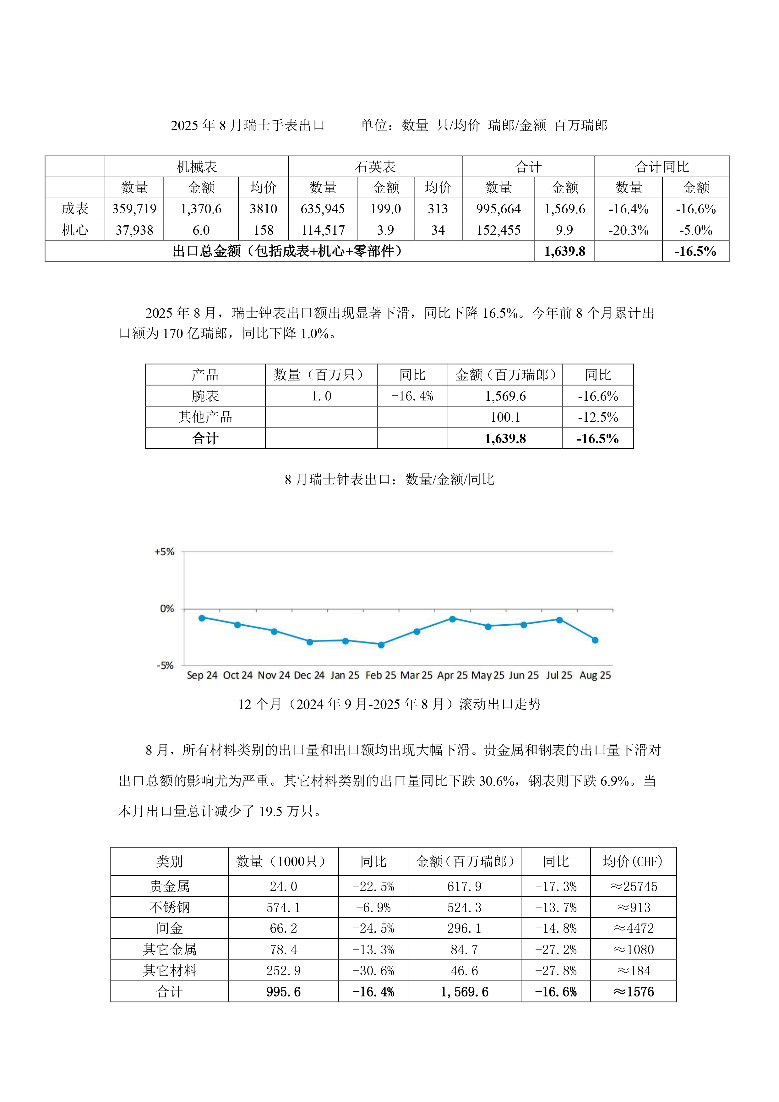 2025年8月瑞士手表月出口统计与分析