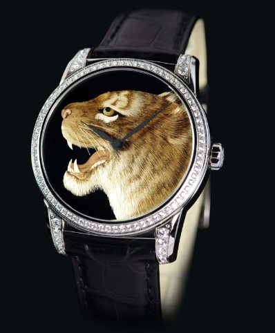该款表盘取意中国古语“龙腾虎啸”之“虎啸生风”,采用精致立体的麦秆镶嵌工艺,纤毫毕现,有若刺绣格调之细腻,层次明暗,恰似国画墨韵之雄深,意态盎然,更如猛虎出山之眈眈,傲啸山林,气势雄浑,在黑色搪瓷表盘润透的色泽中,赋予中国传统古老图腾与时俱进的鲜活美感。攻无不克,战无不胜,方寸之间,虎威凛凛,所向披靡,唯我独尊!