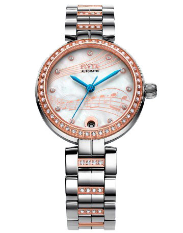 表圈上将象征辉煌与贵族气息的玫瑰金与低调内敛的精钢巧妙配合,镶嵌璀璨宝石,彰显女性优雅魅力,蕴含温馨隽永的情愫。
